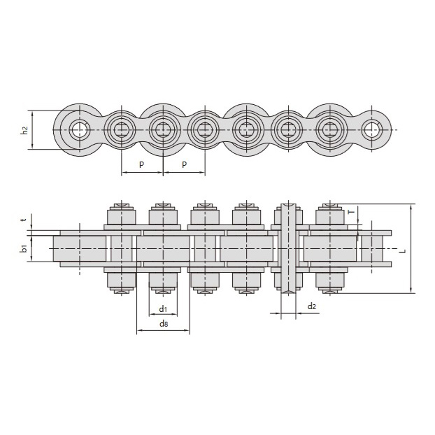 - Design de rolos grandes e pequenos:O primeiro rolo tem um diâmetro maior do que a altura da placa da corrente interna, expondo sua superfície externa além da extremidade da placa da corrente. O segundo rolo é menor, com um diâmetro menor do que a altura da placa da corrente interna.