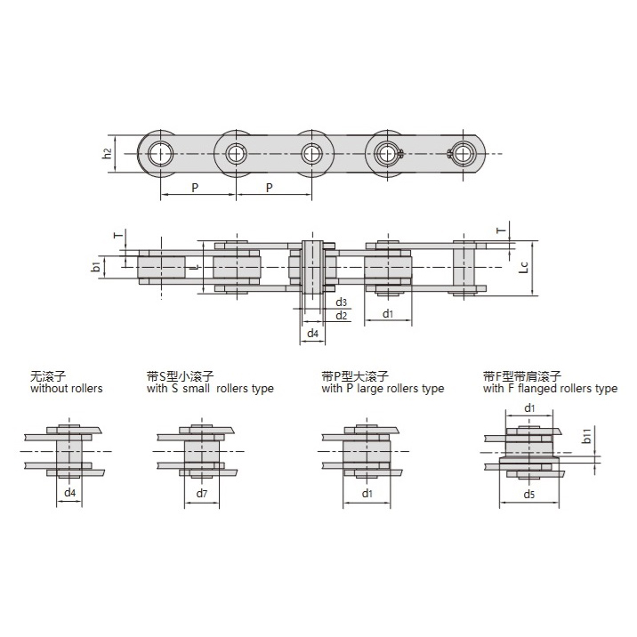 - Disponível em um design sem roletes ou equipada com roletes pequenos do tipo S, roletes grandes do tipo P e roletes com ombro do tipo F para diferentes necessidades de transmissão.